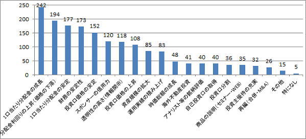 一方、投資口価格の安定や上昇期待を挙げる回答者は25%程度と昨年よりも低下した。既に投資口価格が高い水準にあることや、外国人投資家の投資口売買シェアが高く投資口価格が海外情勢の影響を受けやすい環境下から、投資口価格の推移に注視する傾向が低くなっている点が指摘できる。
