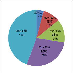 現在の金融資産全体に占めるREIT投資額の割合は、例年同様「20%未満」とする割合が半分近くを占め、REITを分散投資と位置付ける。